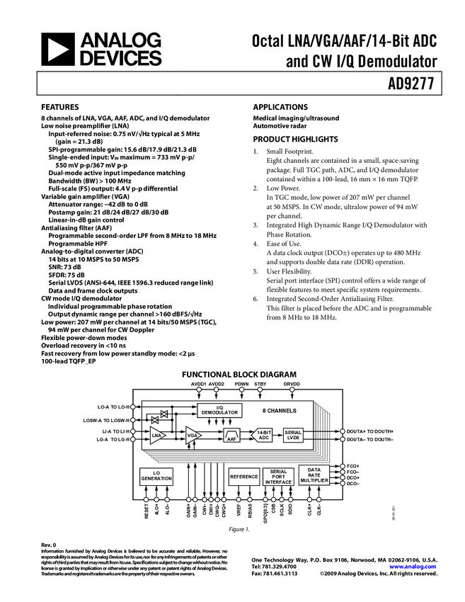 AD9277 Octal LNA/VGA/AAF/14-Bit ADC and CW I/Q Demodulator