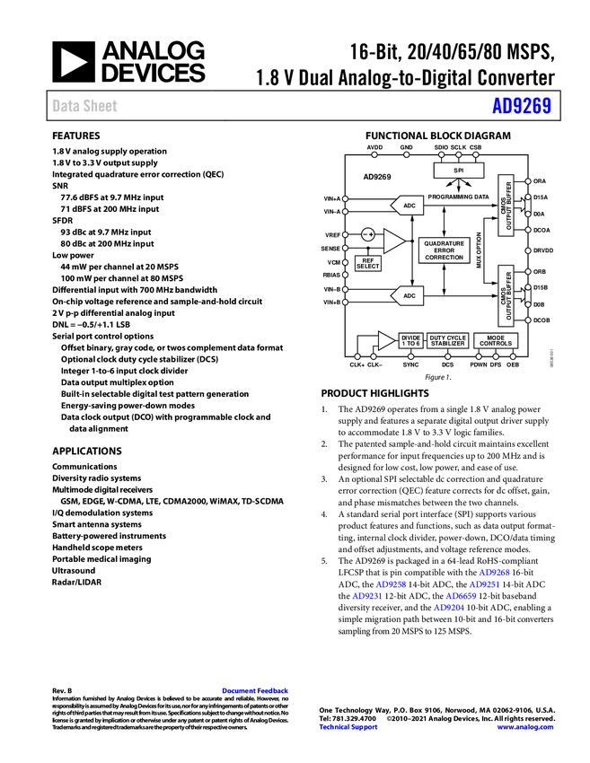 AD9269 16-Bit, 20 MSPS/40 MSPS/65 MSPS/80 MSPS, 1.8 V Dual Analog-to-Digital Conve...