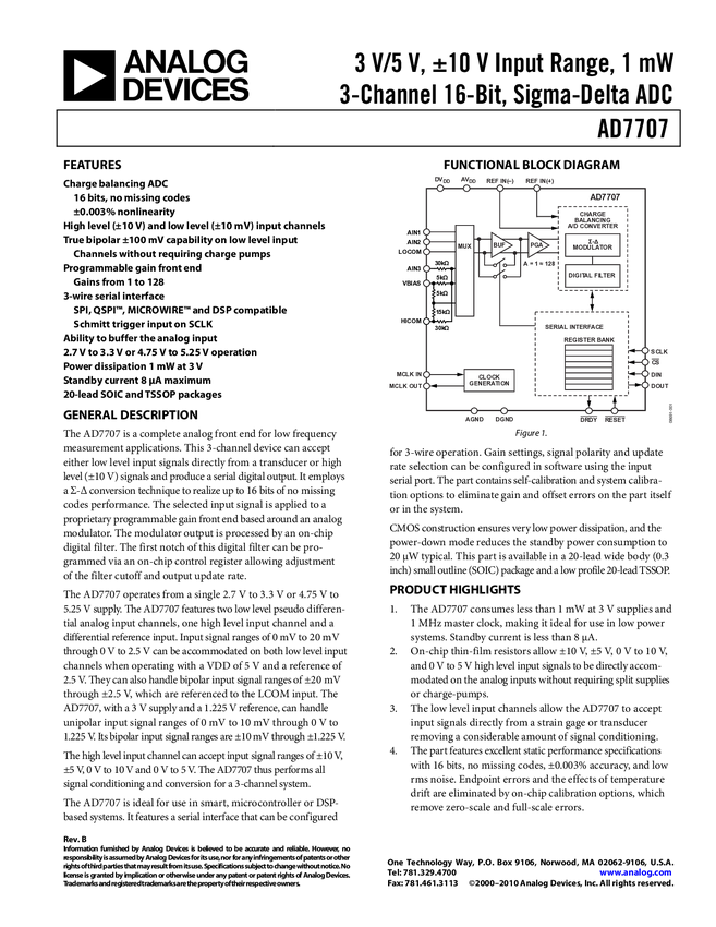 AD7707 3 V/5 V, ±10 V Input Range, 1 mW 3-Channel 16-Bit, Sigma-Delta ADC