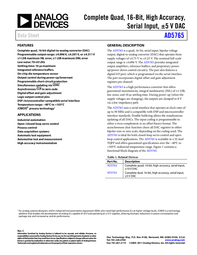 AD5765 Complete Quad, 16-Bit, High Accuracy, Serial Input, ±5 V DAC