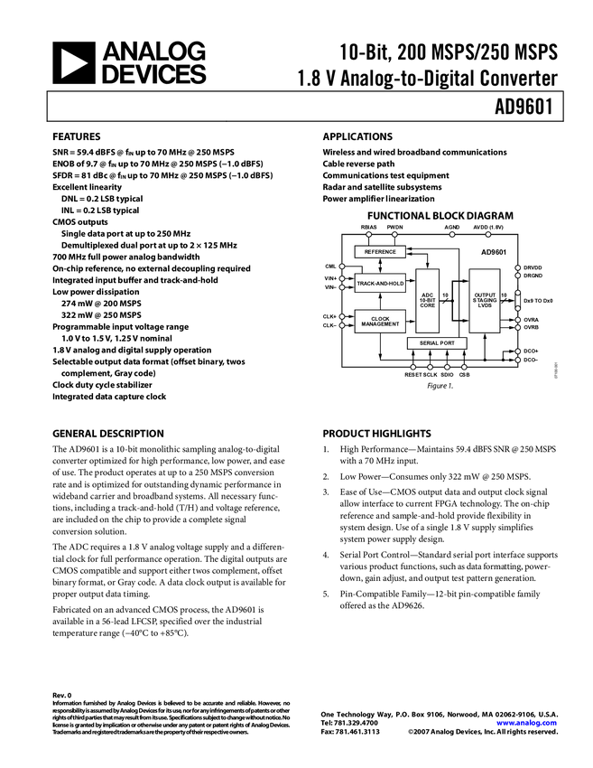 AD9601 10-Bit, 200 MSPS/250 MSPS 1.8 V Analog-to-Digital Converter