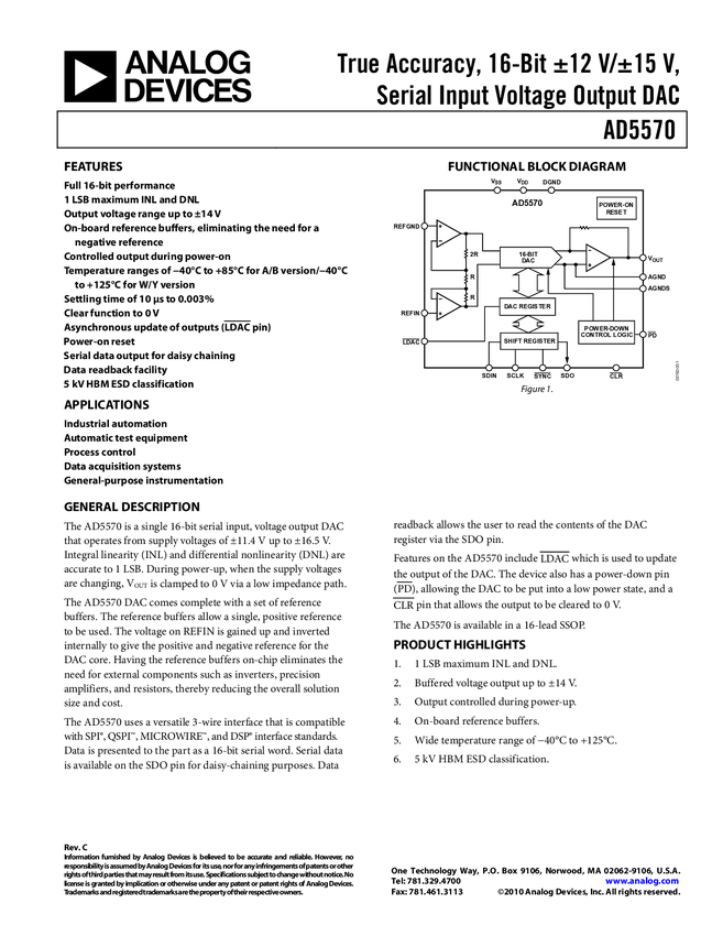 AD5570 True Accuracy, 16-Bit ±12 V/±15 V, Serial Input Voltage Output D/A Converte...