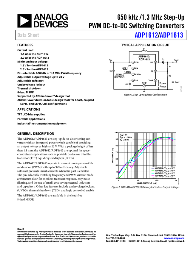 ADP1613 650 kHz /1.3 MHz Step-Up PWM DC-to-DC Switching Converter with 2.0 A Curren...