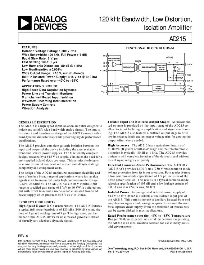 AD215 120 H Bandwidth, Low Distortion, Isolation Amplifier