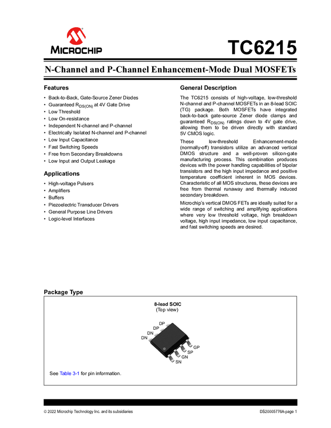 TC6215 N-Channel and P-Channel Enhancement-Mode Dual MOSFETs Data Sheet