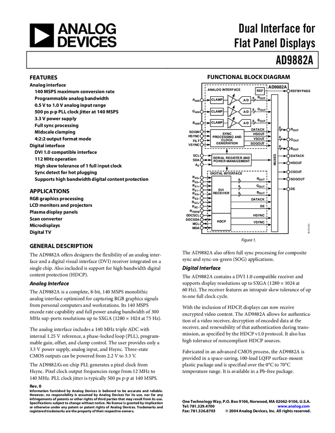 AD9882A Low Cost, Dual Interface Solution For Flat Panel Displays