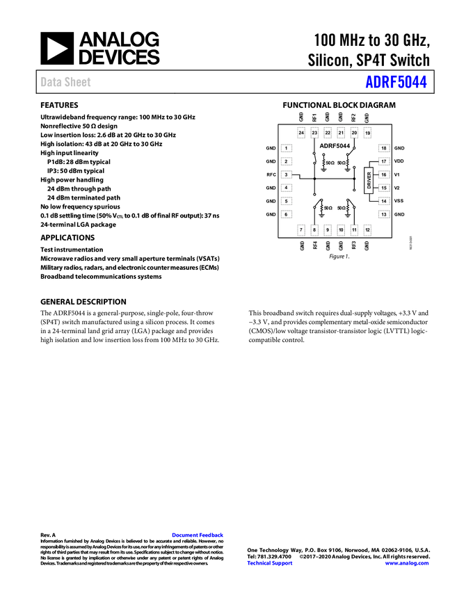 ADRF5044 100 MHz to 30 GHz, Silicon, SP4T Switch