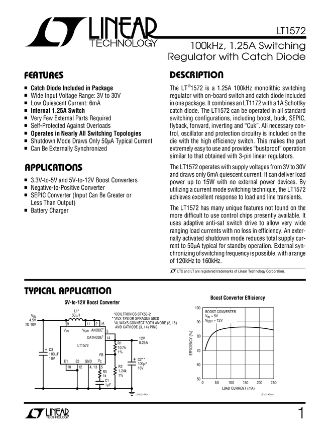LT1572 100kHz, 1.25A Switching Regulator with Catch Diode