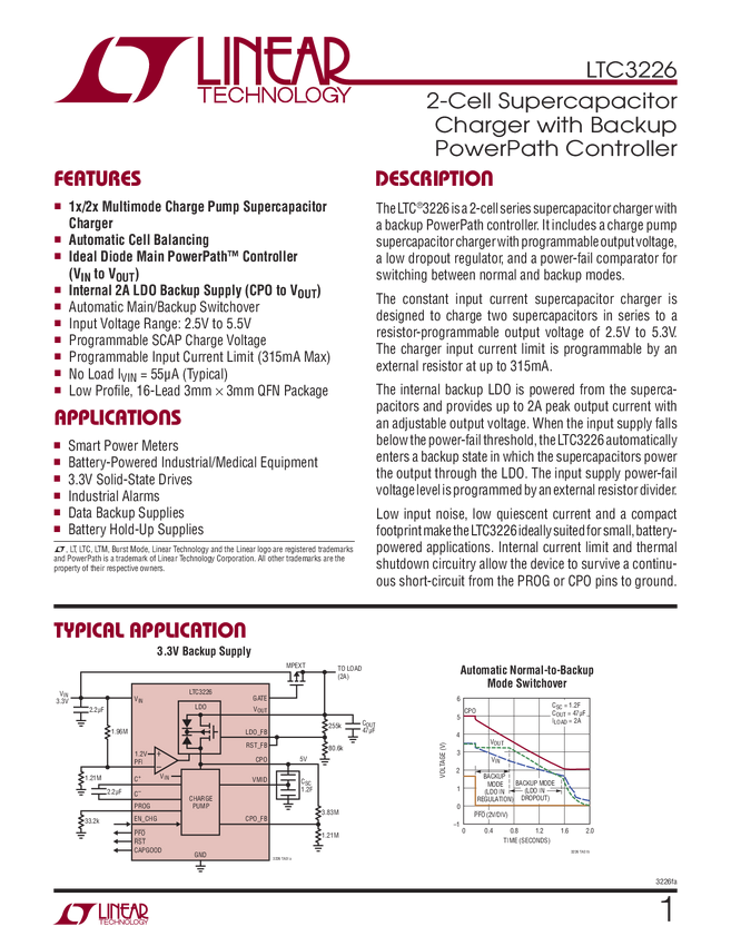 LTC3226 2-Cell Supercapacitor Charger with Backup PowerPath Controller