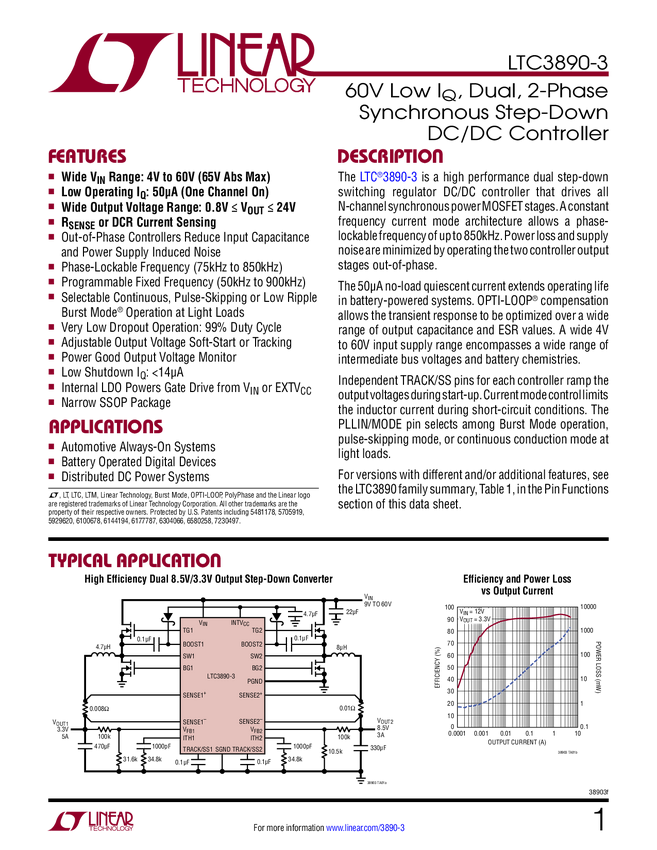 LTC3890-3 60V Low I, Dual, 2-Phase Synchronous Step-Down DC/DC Controller