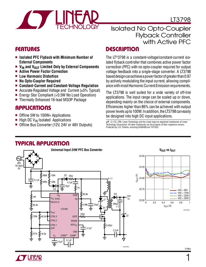 LT3798 Isolated No Opto-Coupler Flyback Controller with Active PFC