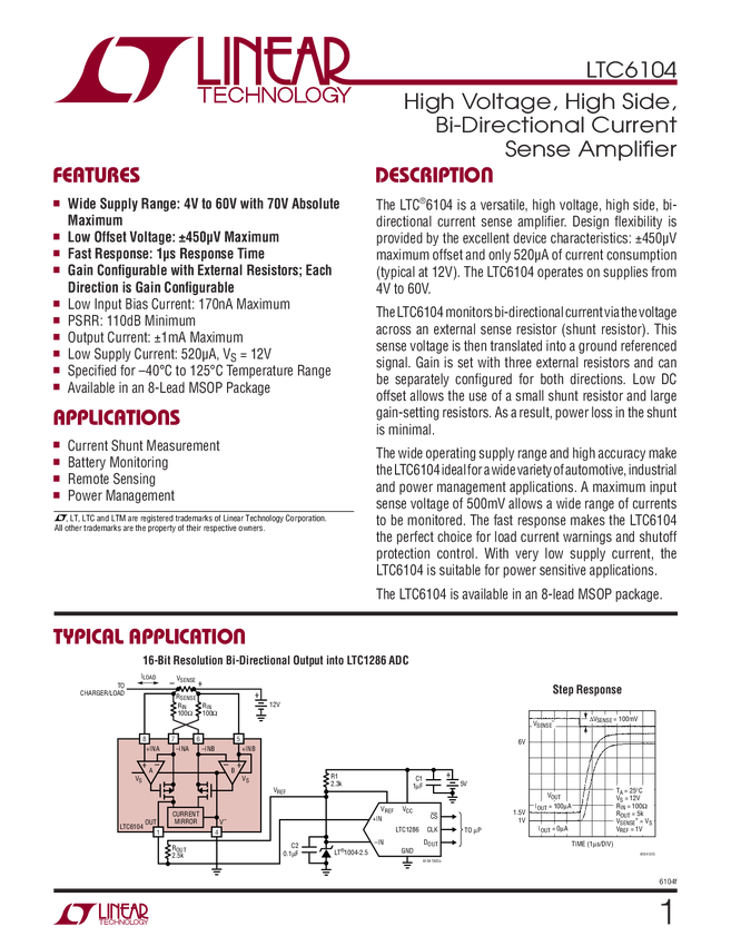 LTC6104 High Voltage, High Side, Bi-Directional Current Sense Amplifier