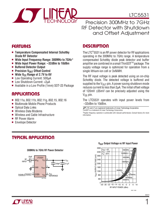 LTC5531 Precision 300MHz to 7GHz RF Detector with Shutdown and Offset Adjustment