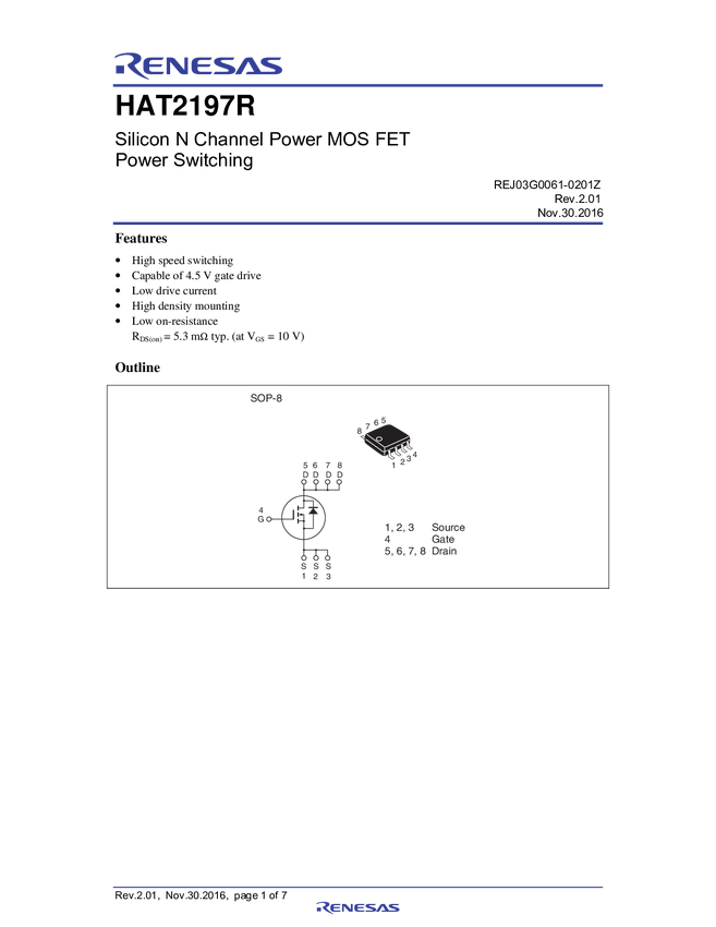HAT2197R Nch Single Power Mosfet 30V 16A 6.7Mohm Sop8