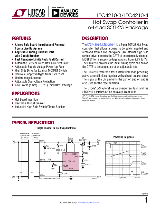 LTC4210-3LTC4210-4 Hot Swap Controller in 6-Lead SOT-23 Package