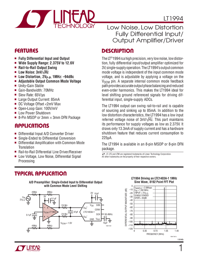 LT1994 Low Noise, Low Distortion Fully Differential Input/Output Amplifier/Driver