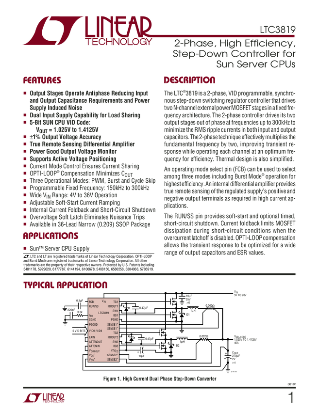LTC3819 2-Phase, High Efficiency, Step-Down Controller for Sun Server CPUs