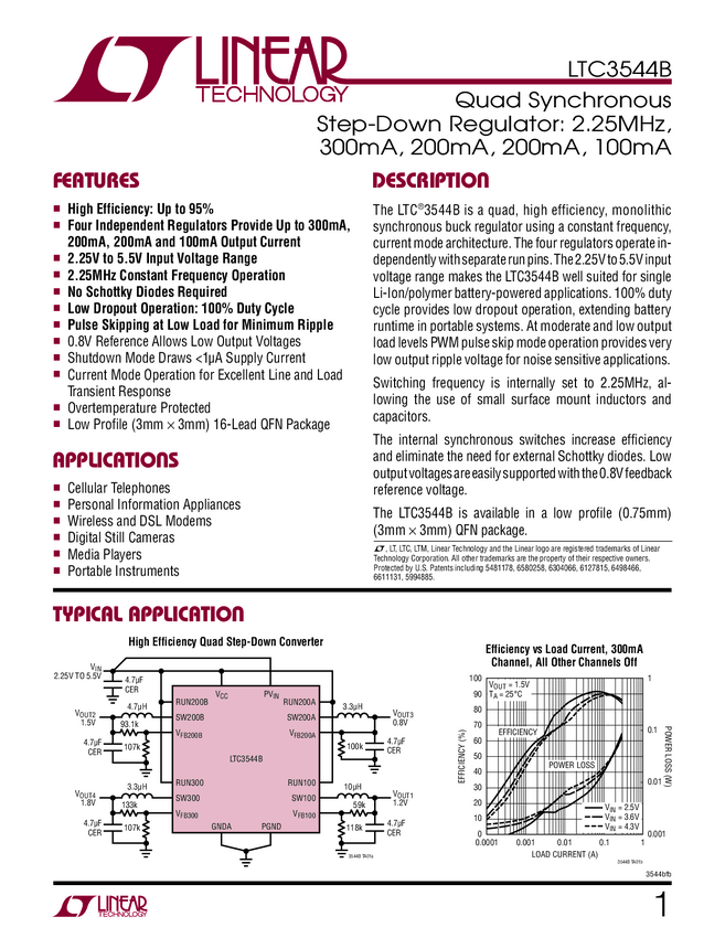 LTC3544B Quad Synchronous Step-Down Regulator: 2.25MHz, 300mA, 200mA, 200mA, 100mA