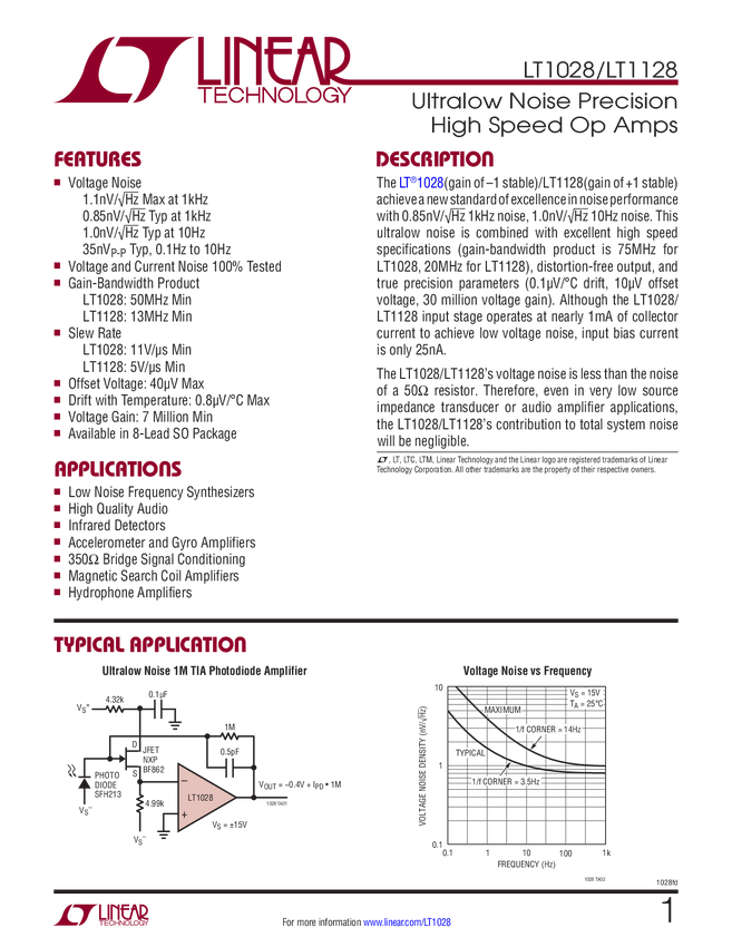 LT1028 Ultra Low Noise Precision High Speed Op Amps