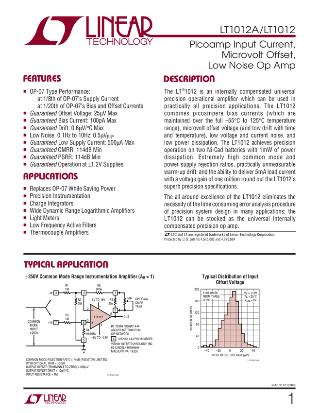 LT1012 Picoamp Input Current, Microvolt Offset, Low Noise Op Amp