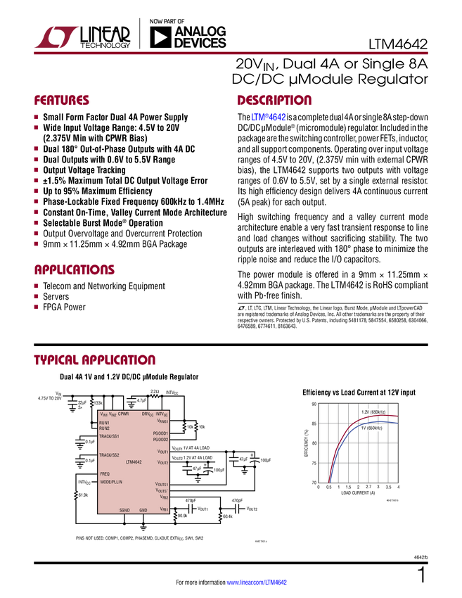 LTM4642 20V, Dual 4A or Single 8A DC/DC μModule Regulator