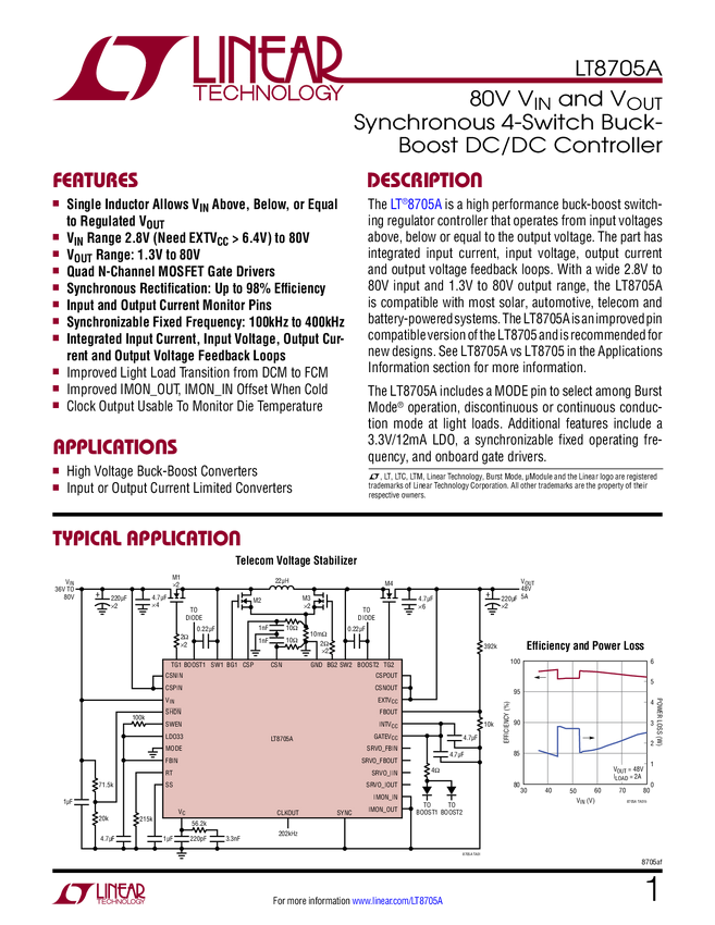 LT8705A 80V V and V Synchronous 4-Switch Buck-Boost DC/DC Controller