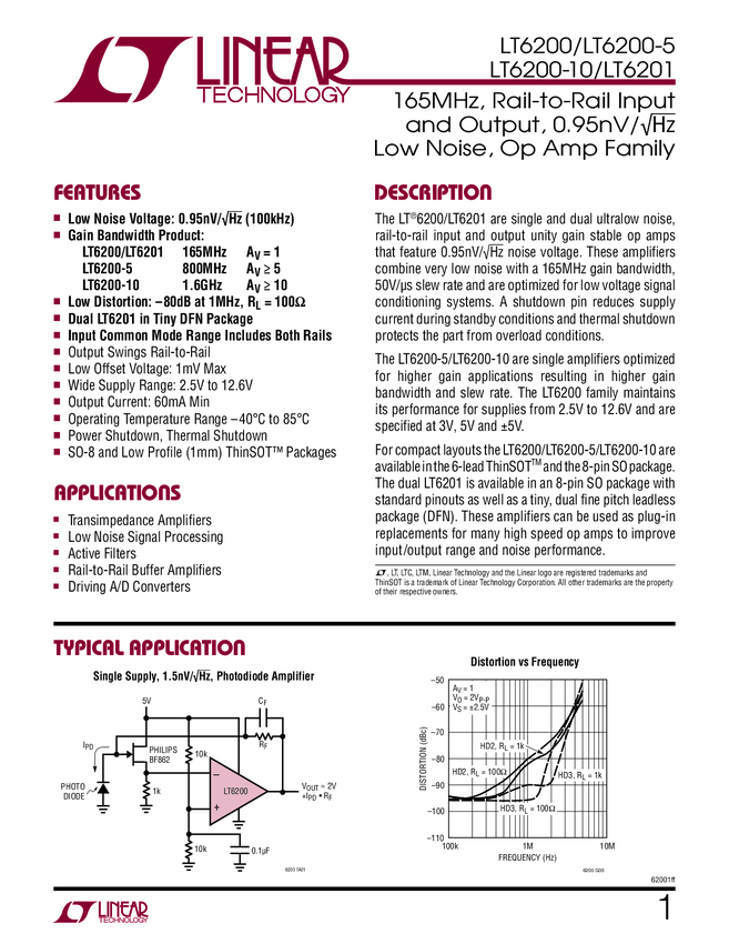 LT6200 Dual 165MHz, Rail-to-Rail Input and Output, 0.95nV/√ Low Noise, Op Amp Fami...