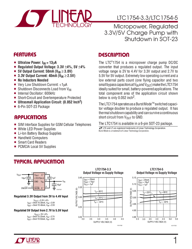 LTC1754 Micropower, Regulated 3.3V/5V Charge Pump with Shutdown in SOT-23