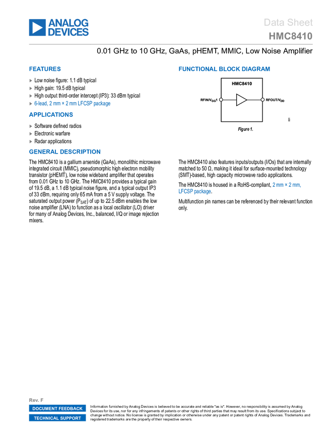 HMC8410 0.01 GHz to 10 GHz, GaAs, pHEMT, MMIC, Low Noise Amplifier