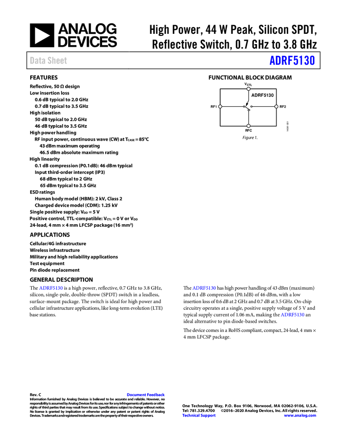ADRF5130 High Power, 44 W Peak, Silicon SPDT, Reflective Switch, 0.7 GHz to 3.5 GHz
