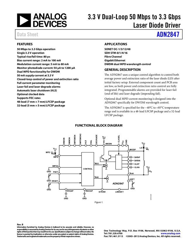 ADN2847 3.3 V Dual-Loop 50 Mbps to 3.3 Gbps Laser Diode Driver