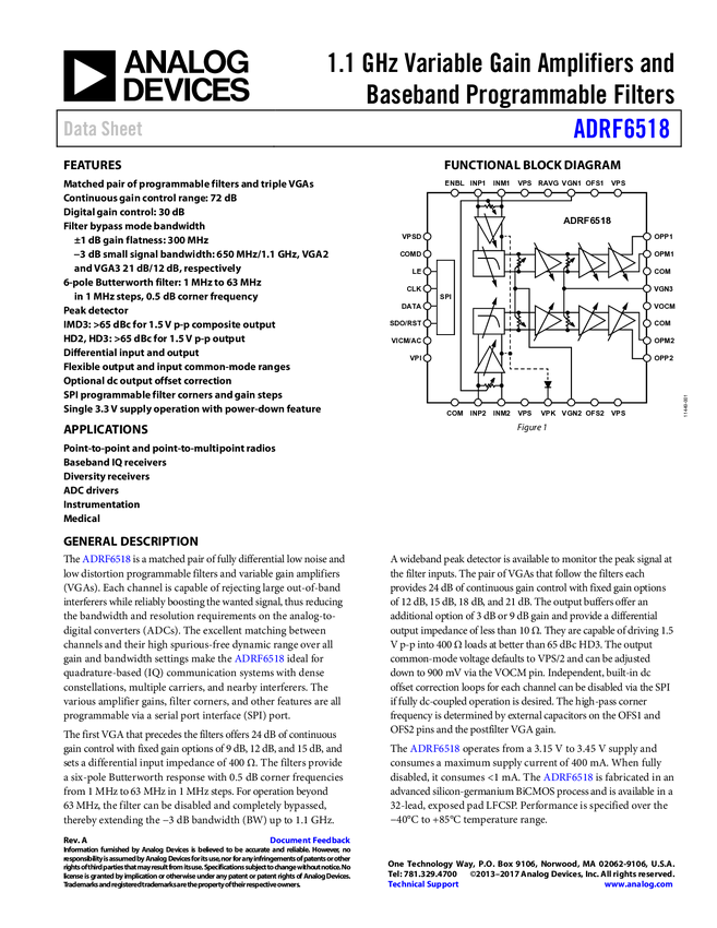 ADRF6518 1.1 GHz Variable Gain Amplifiers and Baseband Programmable Filters
