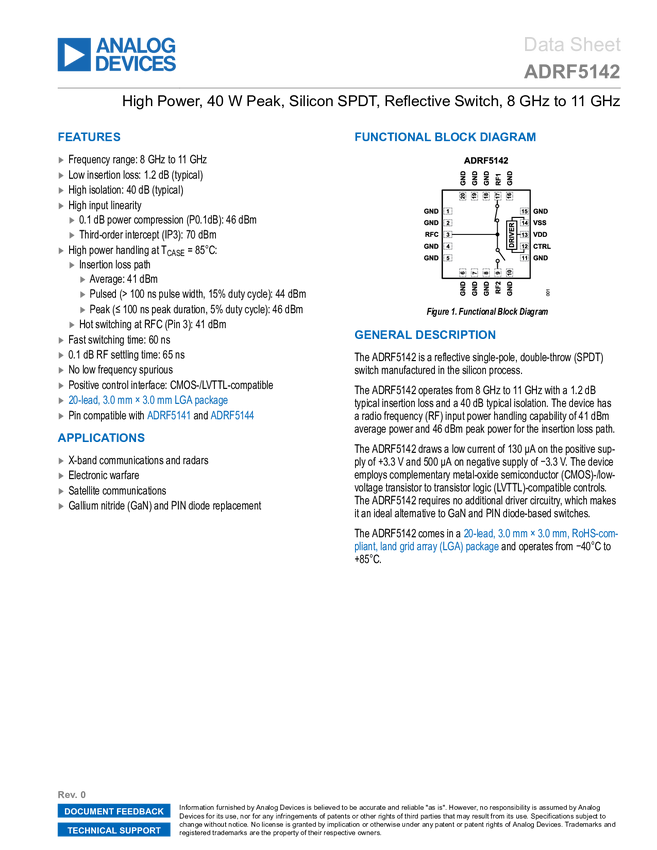ADRF5142 High Power, 40 W Peak, Silicon SPDT, Reflective Switch, 8 GHz to 11 GHz