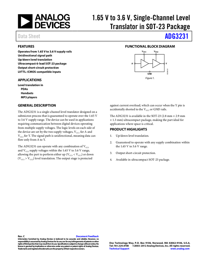 ADG3231 Single-Channel Level Translator with Bi-directional 1.65 V to 3.6 V Level S...