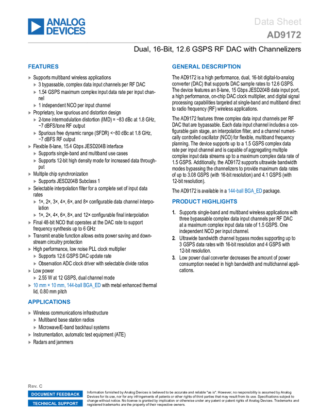 AD9172 Dual, 16-Bit, 12.6 GSPS RF DAC with Channelizers