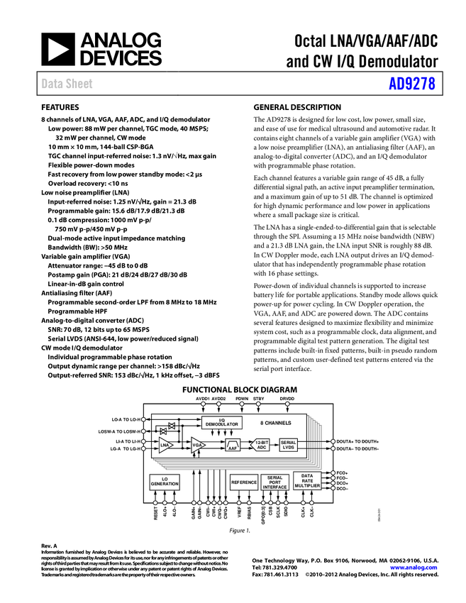 AD9278 Octal LNA/VGA/AAF/ADC and CW I/Q Demodulator