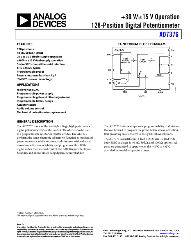 AD7376 +30 V/±15 V Operation 128-Position Digital Potentiometer