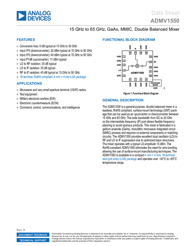 ADMV1550 15 GHz to 65 GHz, GaAs, MMIC, Double Balanced Mixer