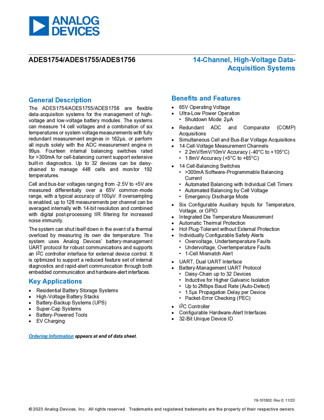 ADES1754 14-Channel, High-Voltage Data-Acquisition Systems