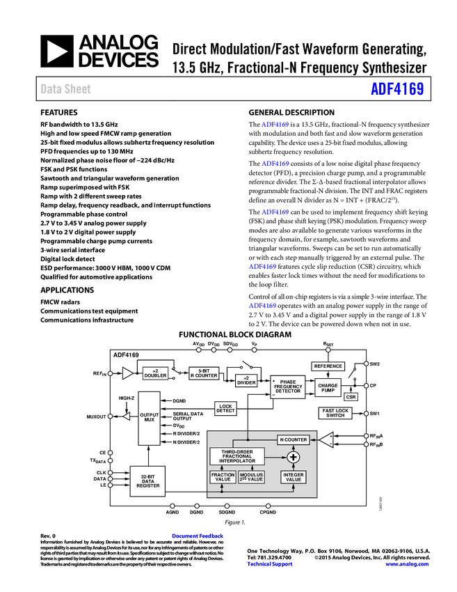ADF4169 Direct Modulation/Fast Waveform Generating, 13.5 GHz, Fractional-N Frequenc...