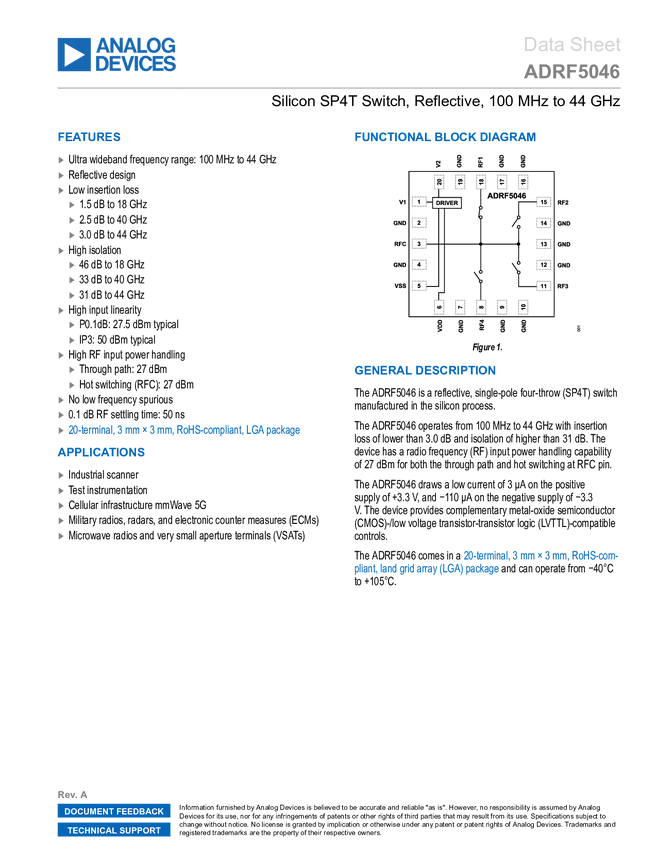 ADRF5046 Silicon SP4T Switch, Reflective, 100 MHz to 44 GHz