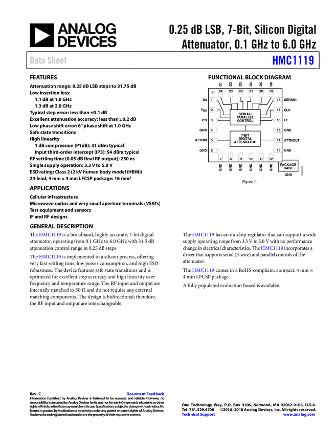 HMC1119 0.25 dB LSB, 7-Bit, Silicon Digital Attenuator, 0.1 GHz to 6.0 GHz