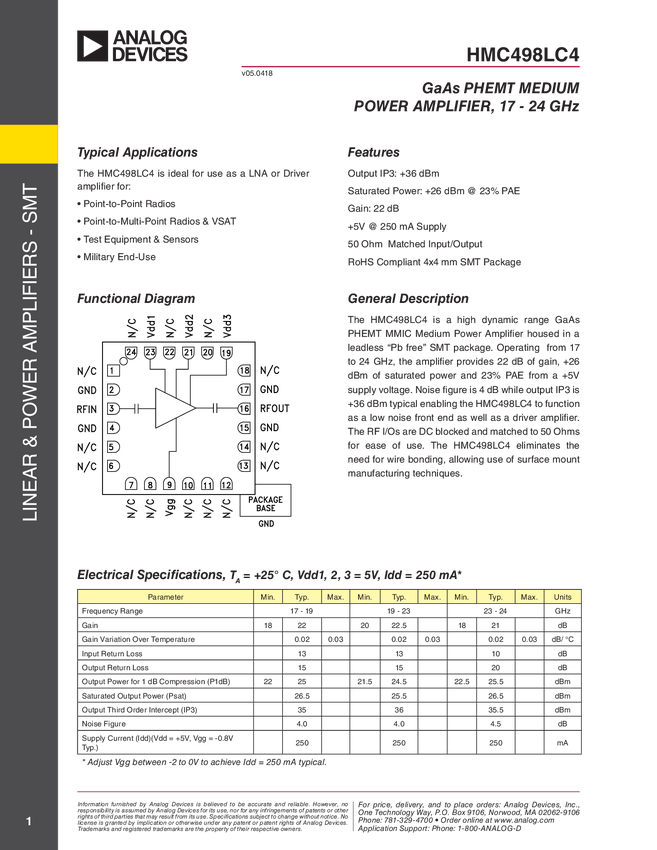 HMC498LC4 Medium Power Amplifier SMT, 17 - 24 GHz