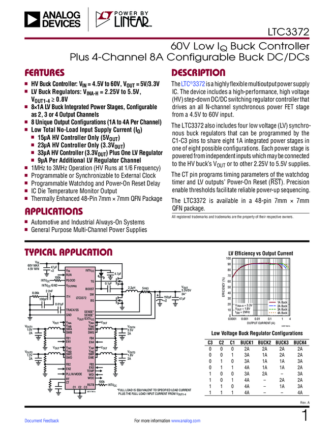 LTC3372 60V Low I Buck Controller Plus 4-Channel 8A Configurable Buck DC/DCs