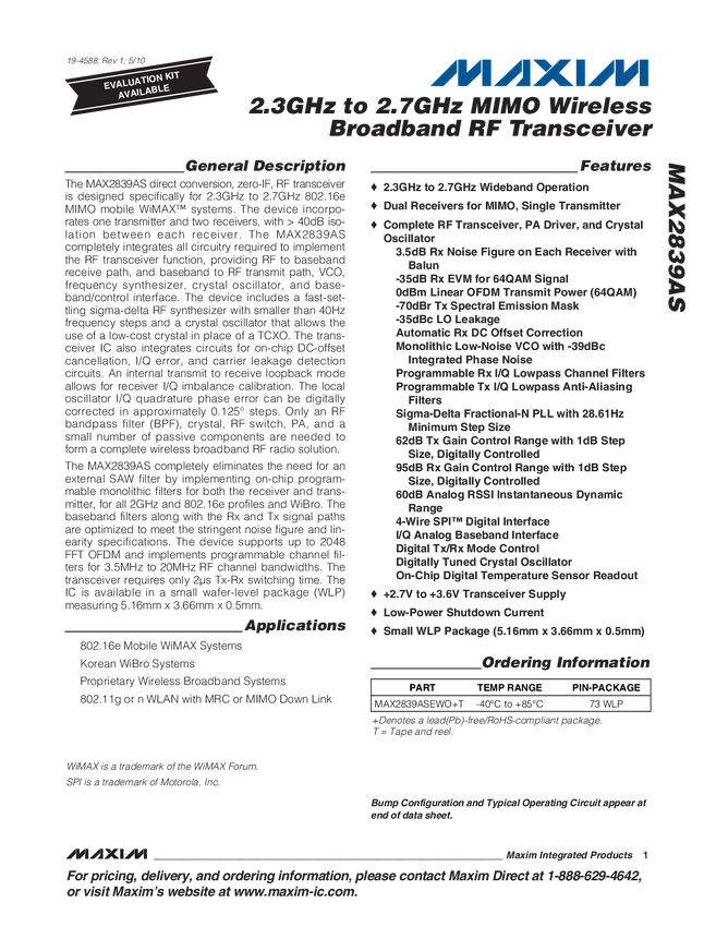 MAX2839AS 2.3GHz to 2.7GHz MIMO Wireless Broadband RF Transceiver