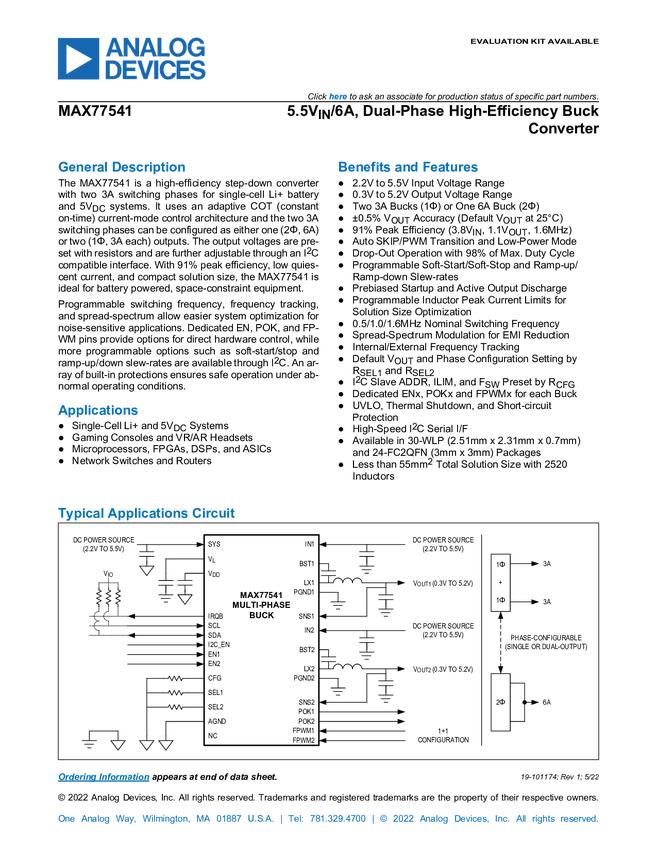 MAX77541 5.5V/6A, Dual-Phase High-Efficiency Buck Converter