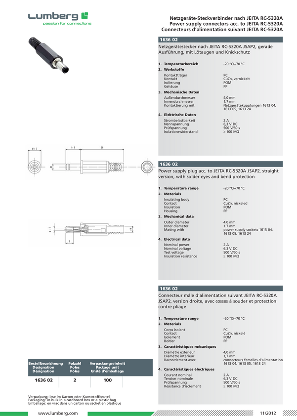 Wtyk; 1636 02; zasilające; DC; żeńskie; 1,7/4/9,5mm; 1,7mm; 4mm; z odgiętką; na przewód; LUMBERG; RoHS