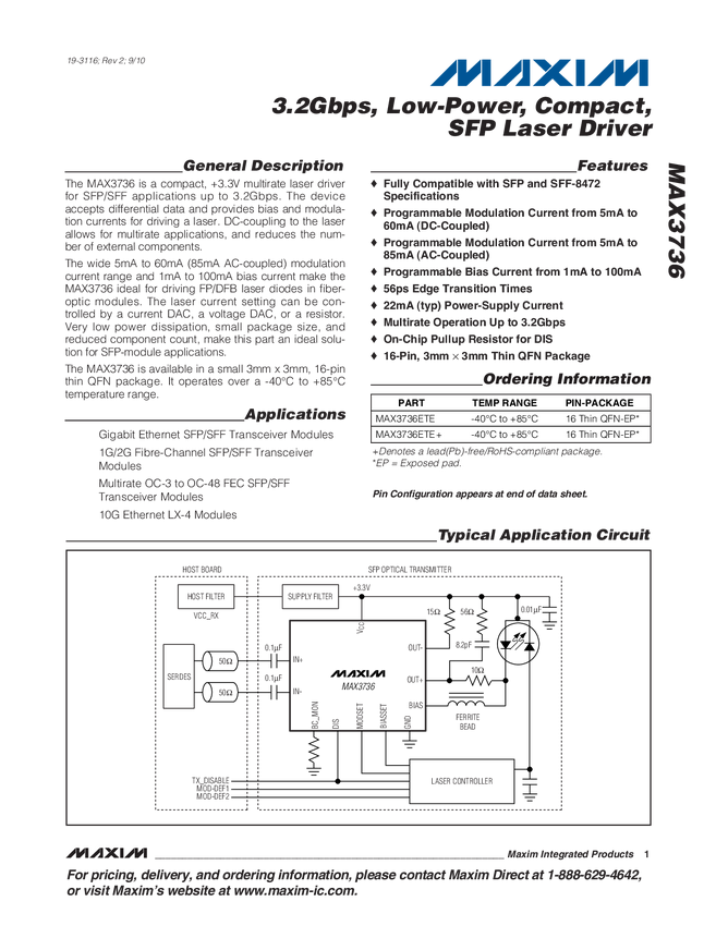 MAX3736 3.2Gbps, Low-Power, Compact, SFP Laser Driver
