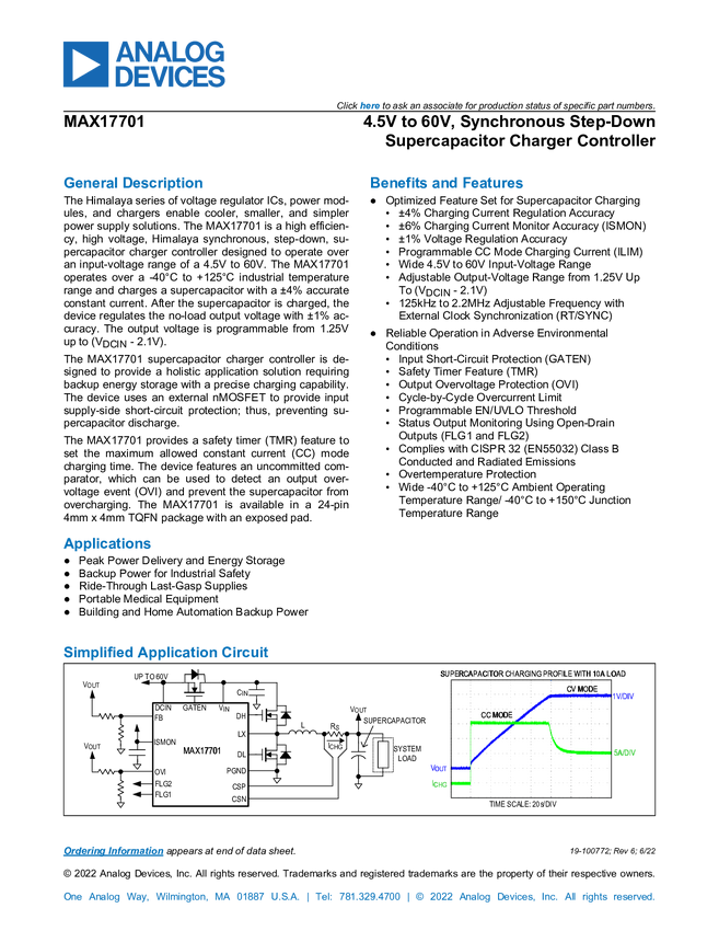 MAX17701 4.5V to 60V, Synchronous Step-Down Supercapacitor Charger Controller