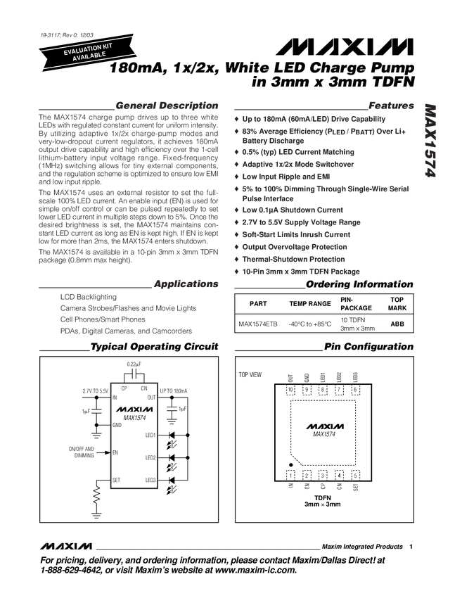MAX1574 180mA, 1x/2x, White LED Charge Pump in 3mm x 3mm TDFN